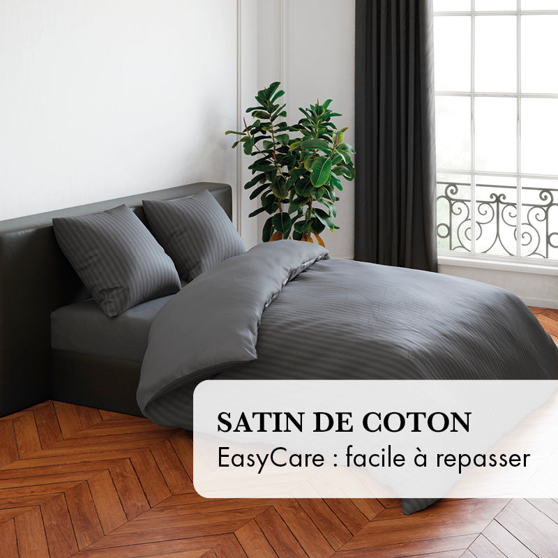 La finesse du satin de coton donne un toucher souple et soyeux, un éclat incomparable. C’est un tissu agréable et doux, respirant et absorbant l’humidité. Grâce à la finition Easy Care le satin de coton se repasse facilement et garantit une nuit de sommeil optimale.