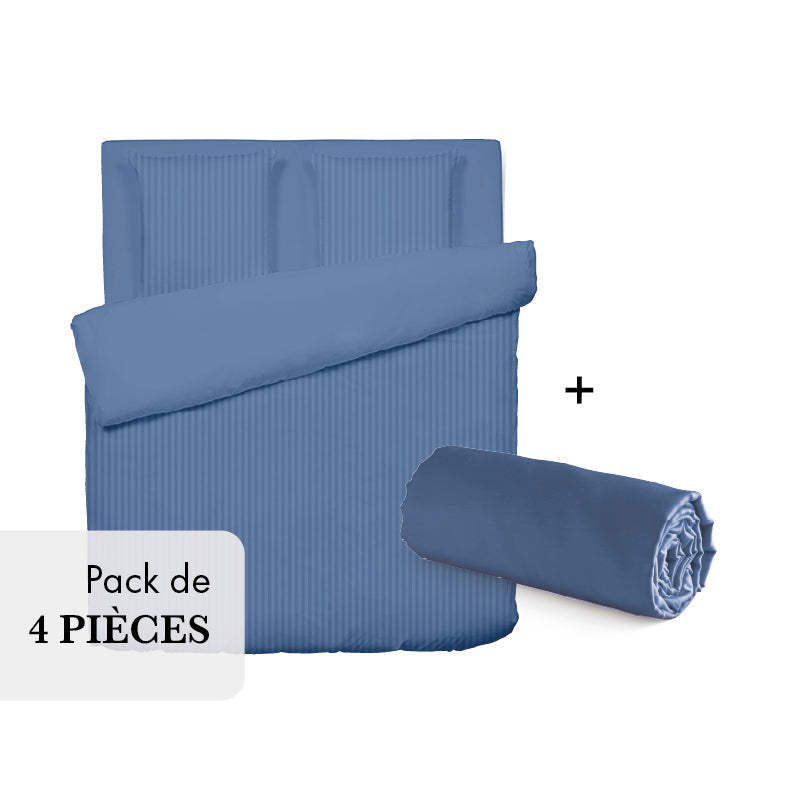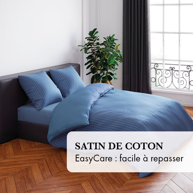 Housse de couette + taie(s) d'oreiller satin de coton - Rayure tissé bleu (Taille)